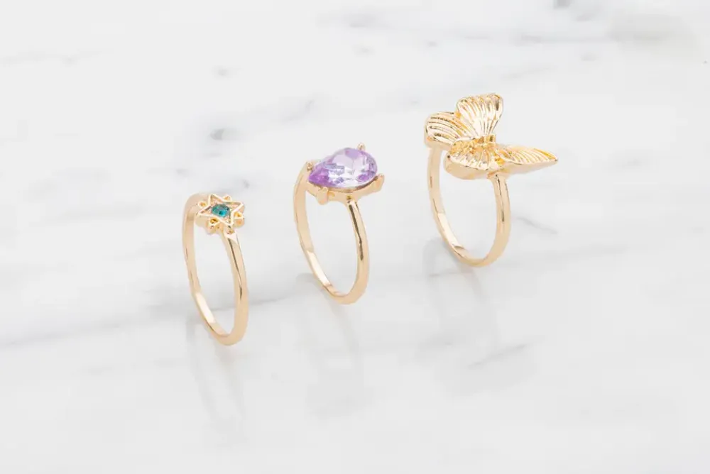 Sæt med tre zinkringe i en smuk guldfinish med unikke designs. Den ene ring er prydet med en smukt formet sommerfugl, den anden ring har en dråbeformet, lilla glassten, og den tredje ring har en grøn facetsleben sten indfattet i en dekorativ stjerneform.Perfekt til både hverdag og festlige lejligheder. Ringene er nikkelfri, hvilket gør dem mere hudvenlige. De er ikke vandresistente og bør opbevares tørt for at bevare deres glans.