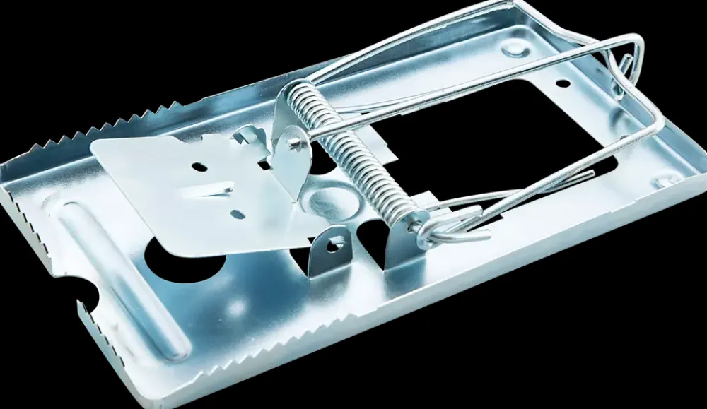 Klapfælde i metal til bekæmpelse af rotter.Placer lokkemaden på fælden og spænd aftrækkeren.