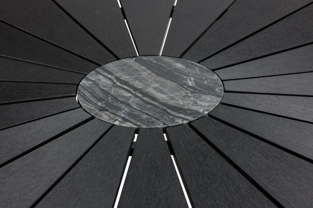 Rundt havebord i sort aluminiumsstel med sorte non-Wood lameller og marmor i midten. Non-Wood er et vejrbestandigt kunstmateriale som ligner træ, men som ikke kræver vedligeholdelse. Alle lameller er UV-behandlet og har derfor et flot udseende i længere tid. UV-beskyttelsen gør at polypropylen ikke arbejder i forhold til varme/kulde og ikke bliver afbleget af solen. Bemærk at marmor er et naturmateriale og derfor kan afvige i farve og mønster i forhold til det viste produktfoto.Bemærk at bordet kommer i to pakker: Pakke 1 med bordplade måler 124 x 123 x 4 cm.Pakke 2 med bordben måler 75,5 x 20,5 x 9,3 cm.