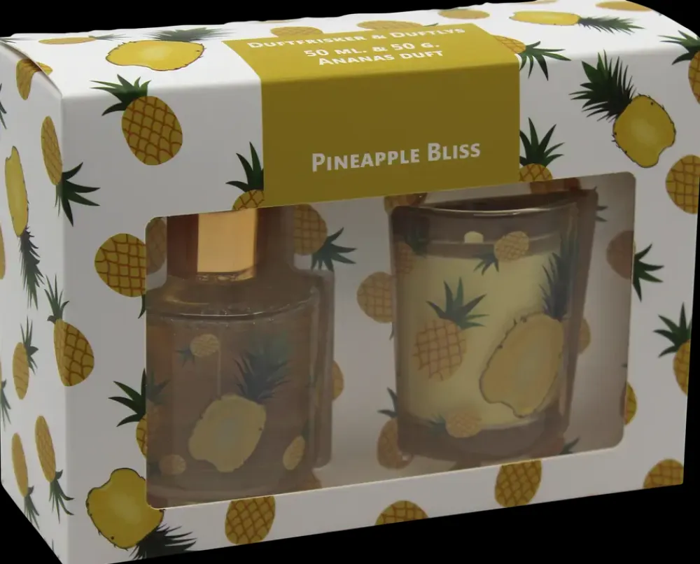 Sæt i glas med dekorative frugtmotiver. Indeholder en duftfrisker (50 ml) og et duftlys (50 g). Vælg mellem jordbær, citrus, vandmelon eller ananas. Glassene er transparente med trykte motiver, der matcher duften. Duftfriskeren giver en vedvarende aroma, mens lyset tilføjer både duft og belysning.Indhold: Duftfrisker (50 ml) og duftlys (50 g).Variant kan ikke vælges ved køb i webshoppen.