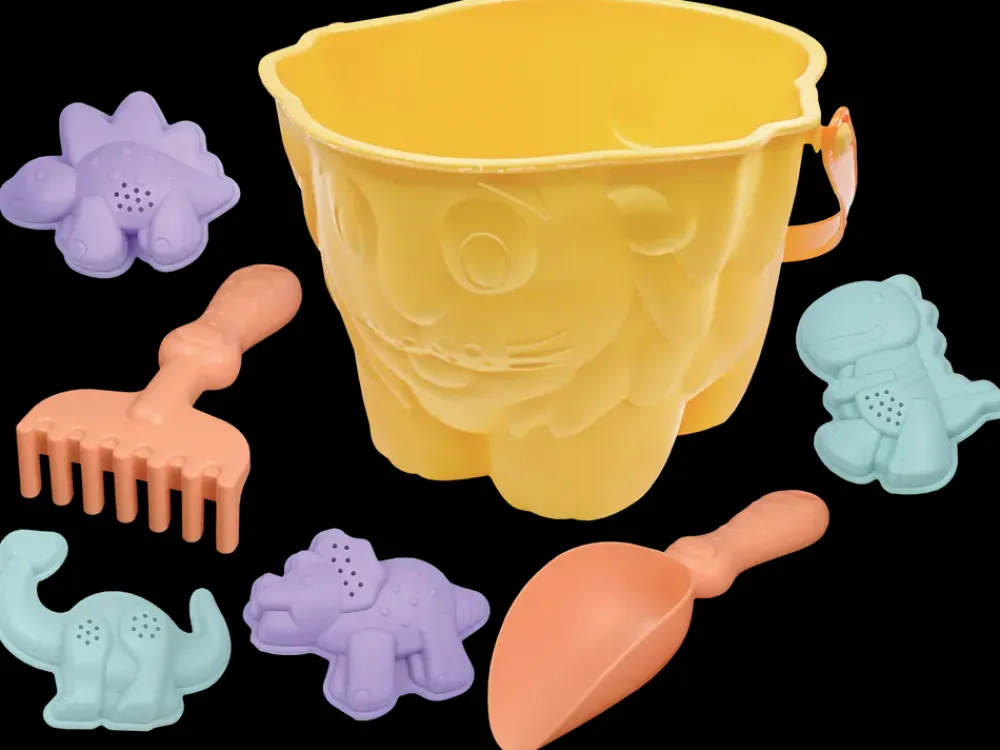 Sæt med alt hvad man skal bruge til en sjov tur på stranden eller i sandkassen.Sættet indeholder 1 løveformet spand, 4 forme formet som dinosaurer samt 2 redskaber (skovl og rive).Skovl: L. 20 cm.Rive: L. 16 cm.Spand: H. 12 x B. 16,5 x D. 16,5 cm.