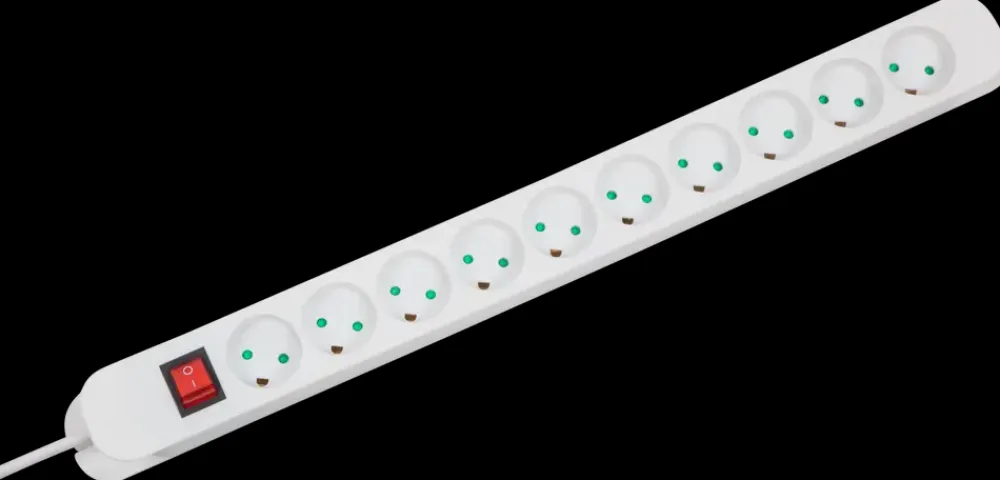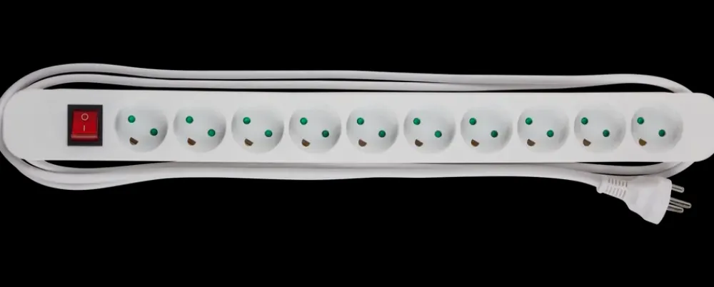 Stikdåse med 10 runde udtag, jordbeskyttelse, ledning og stikprop.Endvidere er stikdåsen udstyret med en afbryder så du nemt og bekvemt kan tænde og slukke for strømtilgangen.