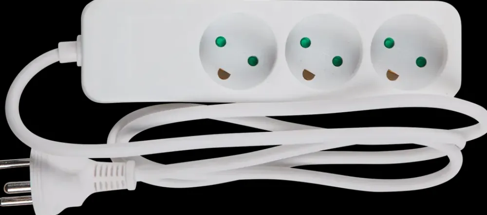 Stikdåse med 3 udtag og jordbeskyttelse samt ledning og stikprop.