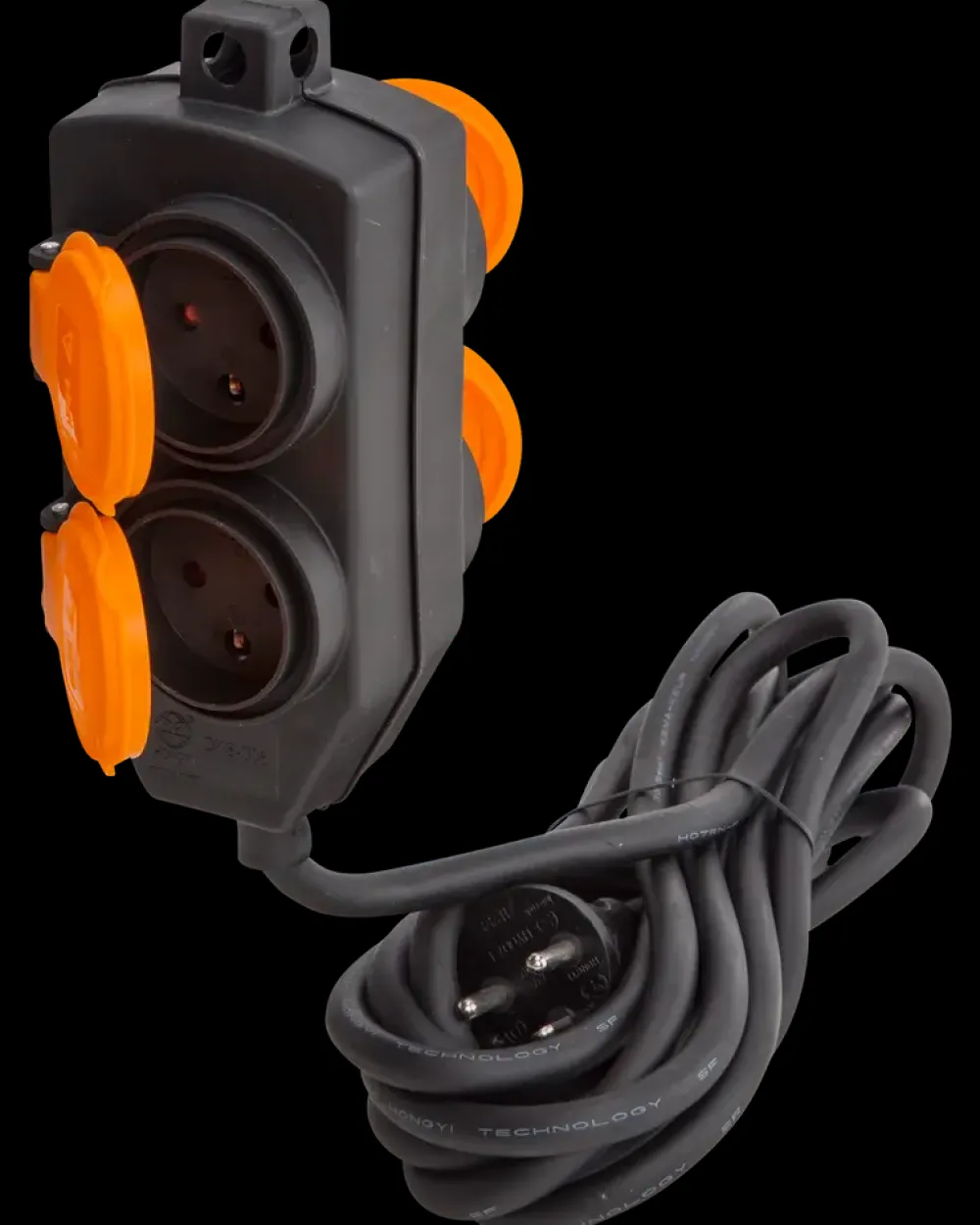 Fordelerboks med 4 x 220V udtag og klaplåg.Dertil er monteret et 5 meter langt neoprenkabel og stikprop med jord.