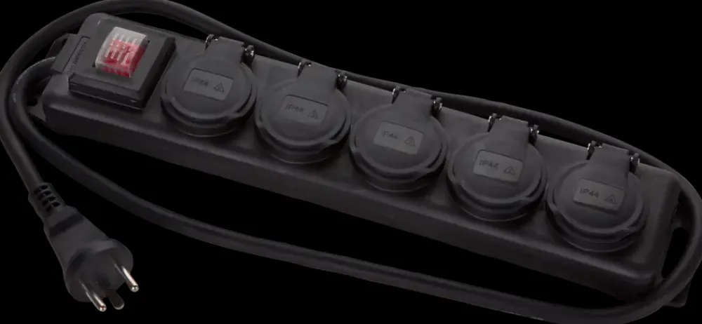 Forgreningsled med 5 x 230V udtag og selvlukkende låg samt ledning og stikprop med jord.3G1 mm².
