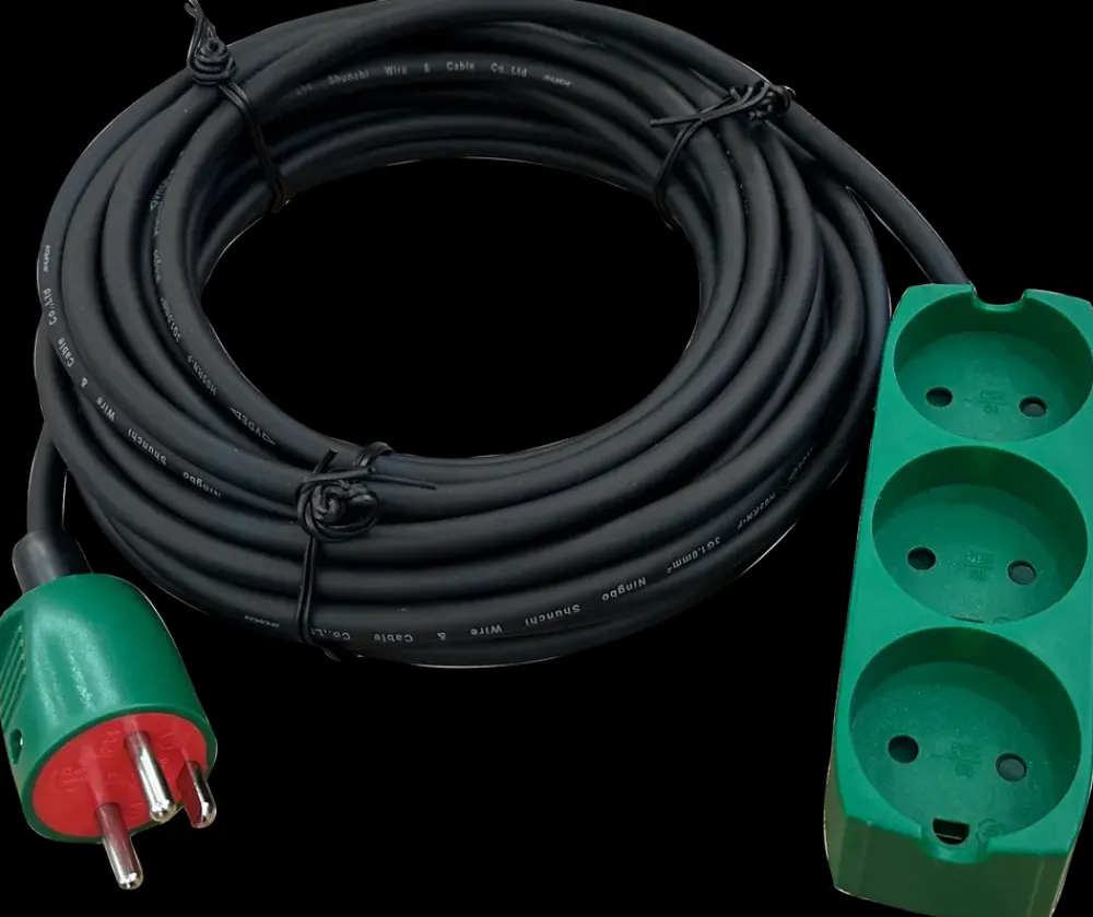 Gummikabelsæt på 10 meter med slagfast stikprop og 3-stikdåse. Udført med jord og børnesikring for øget sikkerhed. Kan bruges indendørs og udendørs i tørt vejr. I fugtige rum må det kun anvendes sammen med dobbeltisolerede apparater.Kablet er type H05RN-F 3×1.0 mm² og tåler op til 10A / 230V~ og maks. 2300 W. Farve: Sort/grøn.