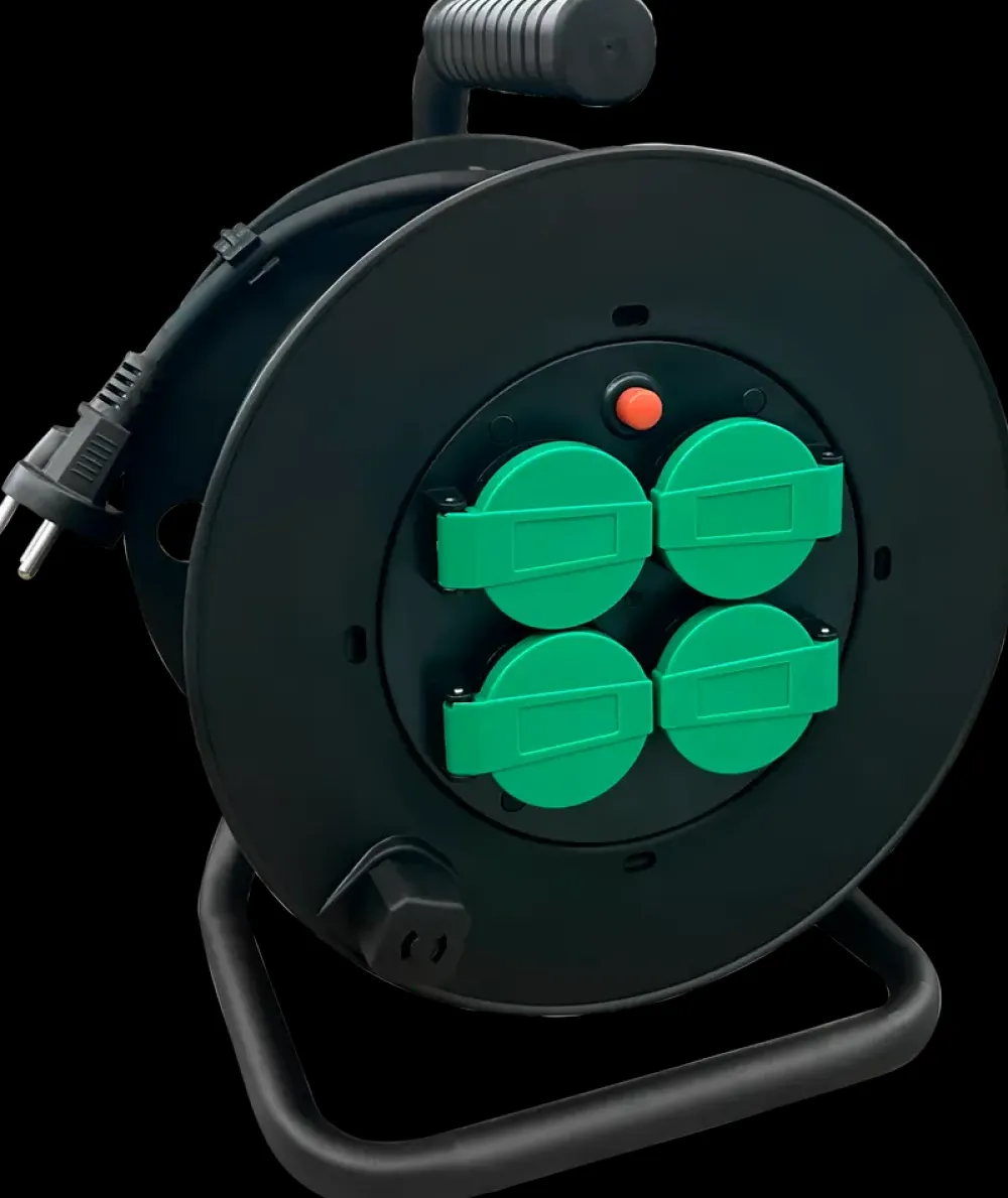 abeltromle med 25 meter gummikabel og fire udtag med beskyttelsesdæksel. Modellen har jord og børnesikring og er IP44-klassificeret, så den kan bruges indendørs og udendørs i tørt vejr. Tromlen står stabilt på metalrammen og har håndtag for enkel transport.Effekten er 1000 W ved oprullet kabel og 2990 W ved helt udrullet kabel. Kabeltypen er H05RR-F 3×1,5 mm².