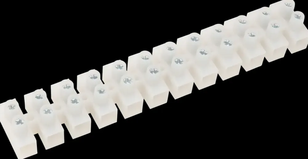 Række med 12 samlemuffer – bruges til nem og sikker samling af ledninger og kabler. Udført med 2 x 12 poler for fleksibel tilslutning i elektriske installationer. Passer til ledninger med tværsnit mellem 4 og 6 mm².Fremstillet i slagfast plast (PA) kombineret med stål og kobber, som sikrer god elektrisk kontakt og lang levetid. Lederne fastholdes sikkert med metalskruer.Rækken kan afkortes efter behov.