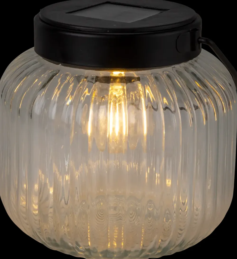 Denne lanterne er soldrevet og er med hank, som giver mulighed for at hænge lanternen op på en krog eller en gren.Glasset har et rillet mønster, der giver et smukt lys og skaber god stemning i din have eller ved din terrasse.Lampen er vandtæt og lader automatisk op om dagen, samt lyser automatisk om aftenen.