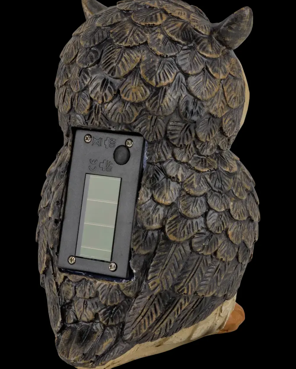 Charmerende ugle med solcellepanel og 1 stk. LED i hvert øje. Skaber stemning og lys i haven når mørket falder på.Udarbejdet i holdbart polyresin, der tåler både vind og vejr.