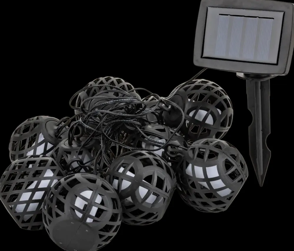 Lyskæde med 10 kugler med flakkende, flammende lys, der giver en hyggelig stemning når mørket falder på.Hver af de 10 kugler har en krog, der gør det nemt at opsætte kæden.Med solcellepanel og 2 meters tilgangsledning. 30 cm afstand mellem hver lyskugle.Totallængde på 4,7 meter.Hver kugle måler: H. 6,2 x B. 7,2 cm.
