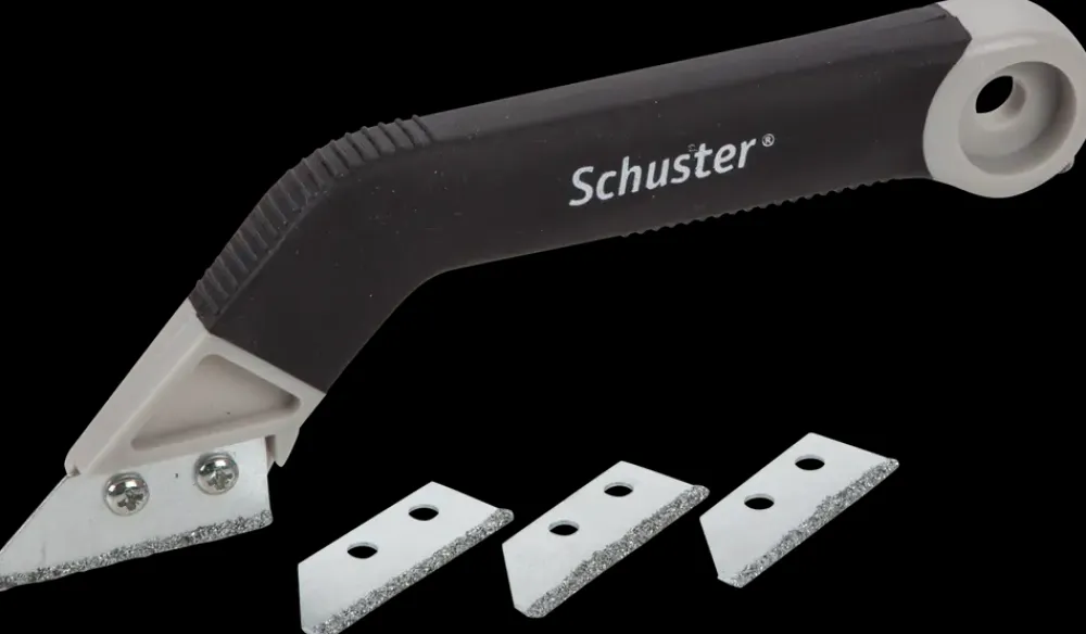 Fugeskærer fra Schuster til fjernelse af gamle fuger.Med gummihåndtag og klinge med belægning af wolframkarbid. Leveres med 4 stk klinger.