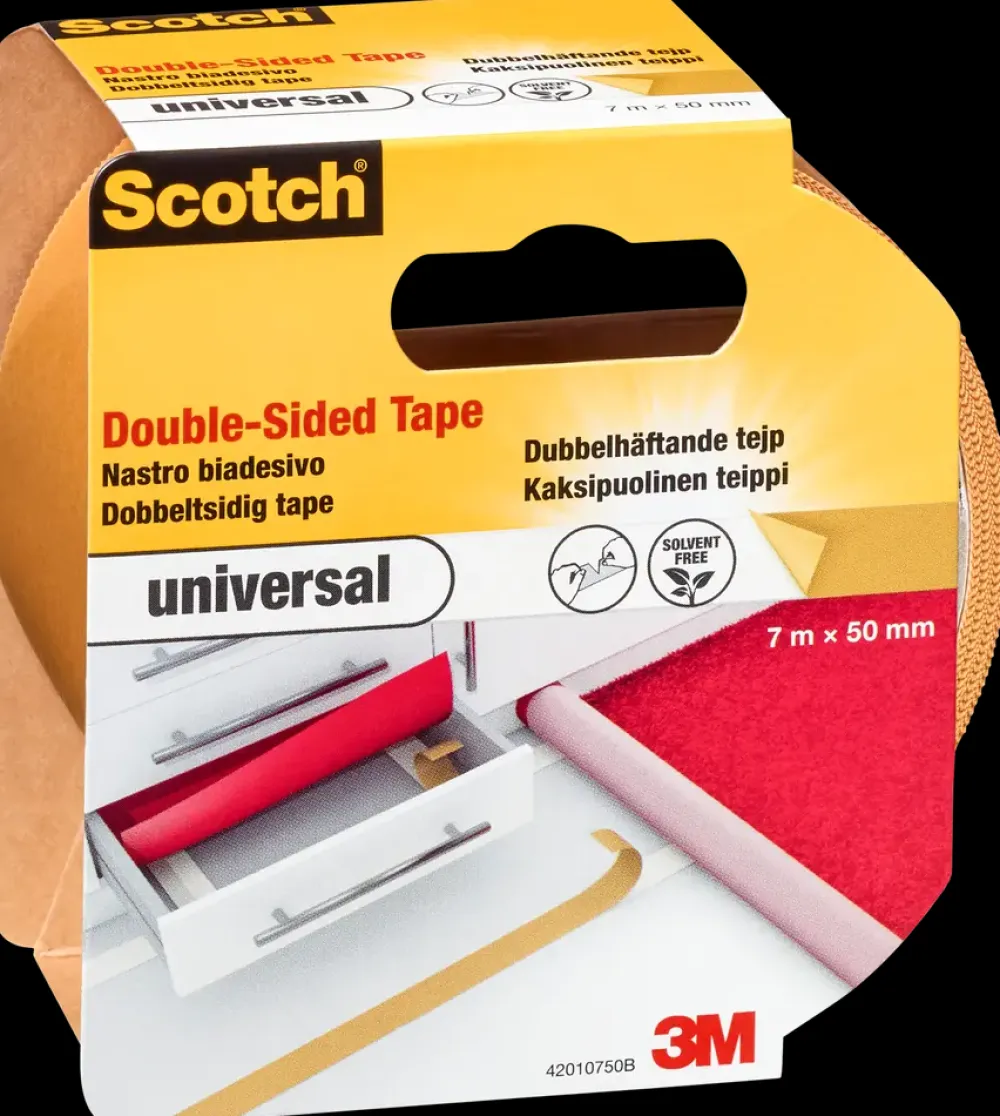 Scotch® dobbeltklæbende universal tape er velegnet til fastgørelse af gulvtæpper, dekorationer og forskellige kreative opgaver i hjemmet. Tapen anvendes, hvor der ønskes en hurtig og sikker vedhæftning uden brug af flydende lim eller fast kontaktpres.Tapen har en høj klæbeevne, som giver en stabil og permanent fastgørelse på egnede overflader. Den fungerer bedst på rene og tørre flader og kan bruges til både midlertidige og mere varige monteringsopgaver. Tapen kan rives over i hånden, hvilket gør arbejdet nemt og fleksibelt uden behov for værktøj.Produktet er fri for opløsningsmidler og er udviklet til at efterlade overfladen uden synlige mærker efter brug. Den dobbeltsidede opbygning gør tapen anvendelig i mange forskellige situationer, hvor der ønskes en diskret og effektiv montering.Tekniske oplysninger:Længde: 7 mBredde: 50 mmFarve: BrunType: Dobbeltklæbende tape