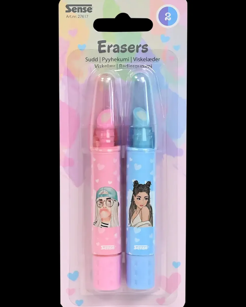 Viskelæder formet som læbestift, praktisk og let at bruge. Leveres i 2-pak med én lyserød og én blå variant.Hver viskelæder er indsat i et plastetui, som beskytter viskedelen og gør det nemt at skubbe viskelæderet frem under brug.