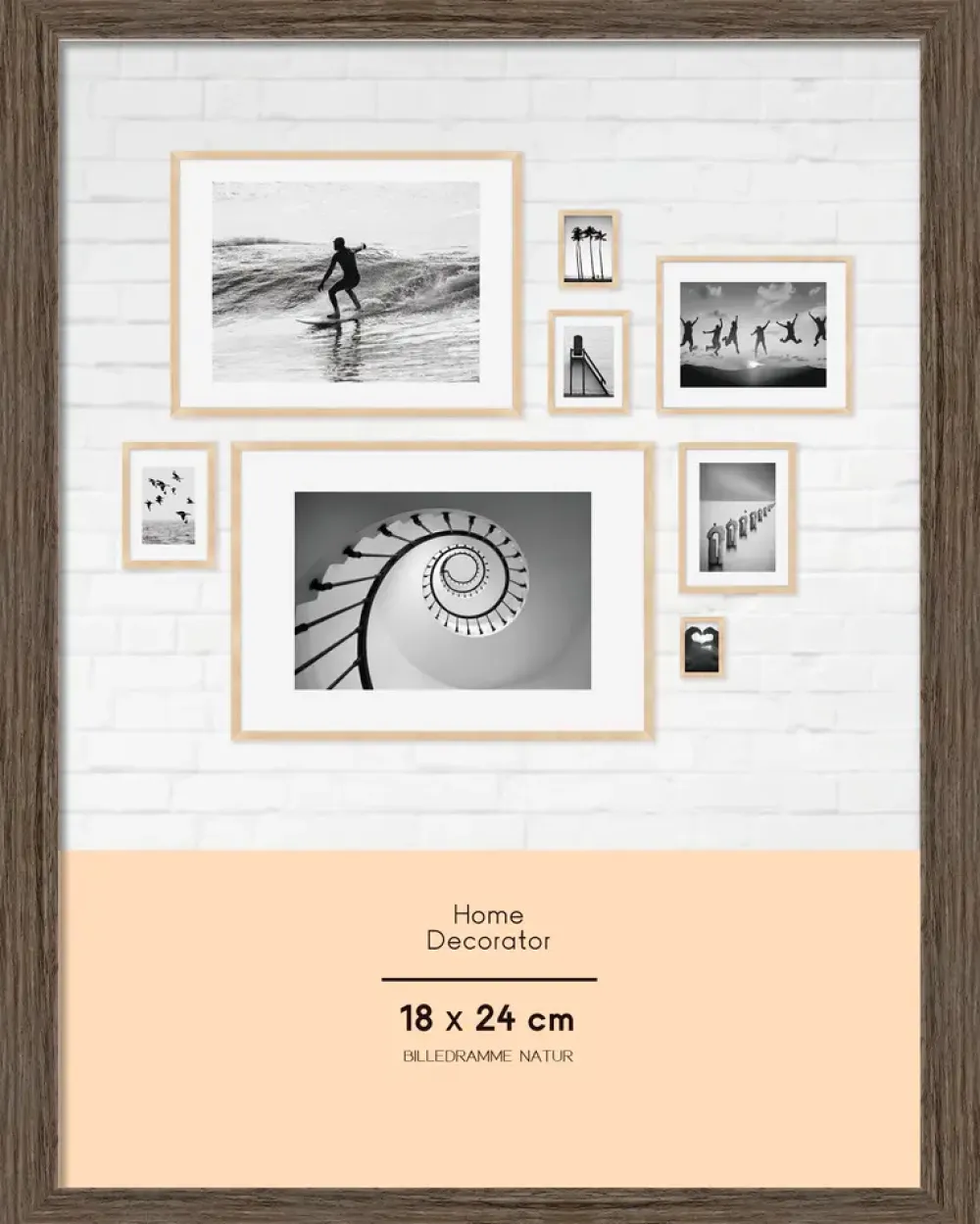 Let og holdbar billedramme i polystyren, designet til ophæng eller placering på en flad overflade. Måler 18 x 24 cm og har en valnøddefarvet finish, der giver et klassisk udtryk.Materialet er ridse- og revnebestandigt, hvilket sikrer lang holdbarhed. Den lette konstruktion gør rammen nem at håndtere og ophænge.Rengøres let med en fugtig klud.