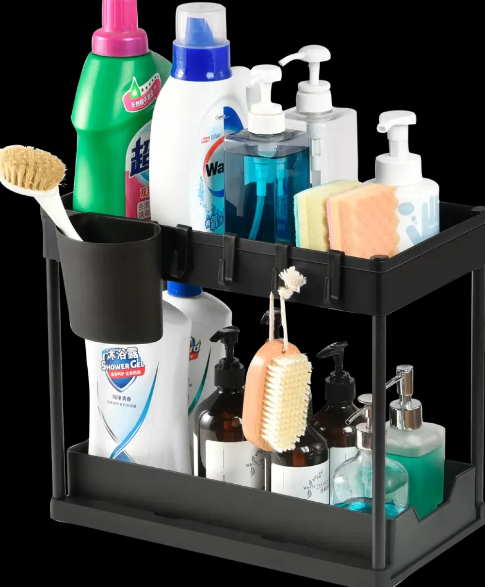 Funktionelt opbevaringsstativ med to hylder, velegnet til organisering af rengøringsmidler, flasker og småartikler i køkken, badeværelse eller bryggers. Stativet kan også placeres inde i et skab og fungerer som ekstra indretning til udnyttelse af pladsen.Det dobbelte hyldedesign giver mulighed for opdeling af indholdet i niveauer, mens fire kroge og en sidelomme tilføjer ekstra opbevaringsplads til mindre genstande. Den nederste hylde kan trækkes ud, hvilket giver nem adgang til indholdet – også bagerst. Drænhuller i bunden sikrer ventilation og reducerer fugt.Fremstillet i plast (PP) og stål for en let, men stabil konstruktion. Samles nemt uden brug af værktøj.Mål (samlet): H36 x B22 x L40 cm.Farve: Sort.