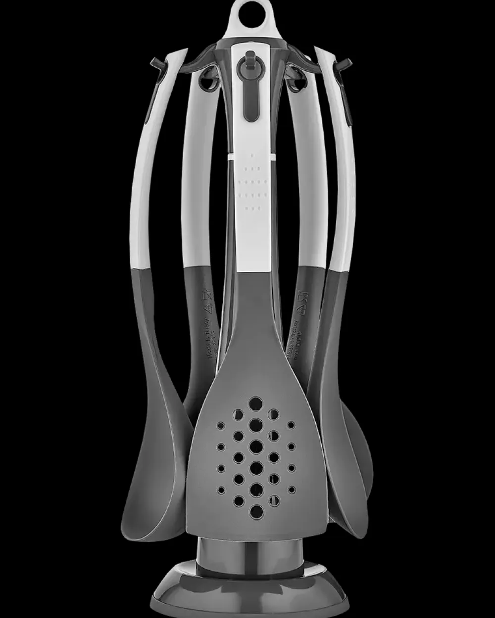 Dette praktiske redskabssæt består af en holder og fem redskaber: palet, pastaske, hulske, slev og serveringsske. Sættet er ideelt til brug på non-stick og teflonbelagte overflader. Redskaberne tåler op til 180°C og kan vaskes i opvaskemaskinen.