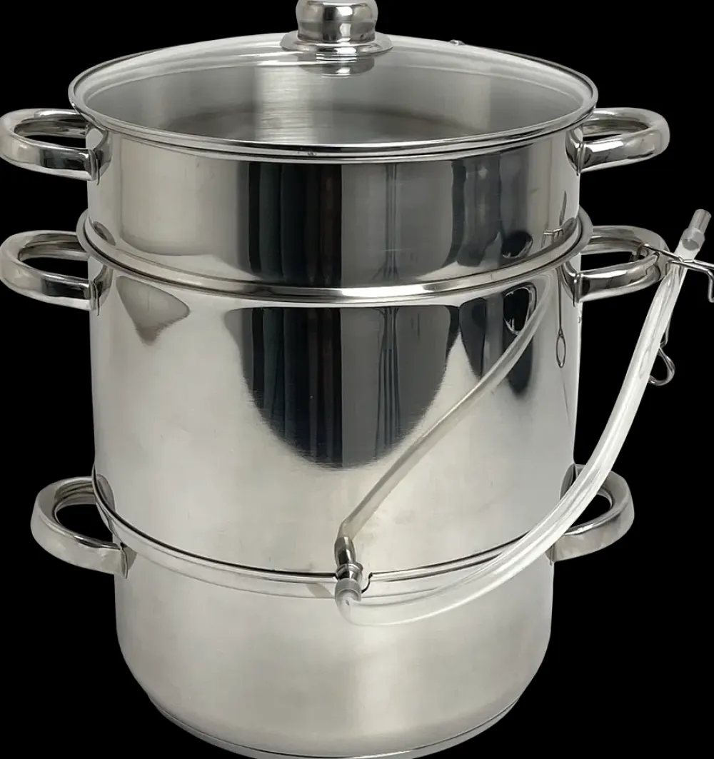 Lav hjemmelavet saft af bær og frugter med denne klassiske saftkoger. Udstyret med en silikoneslange med metalclips og et glaslåg med damphul gør den det let at følge processen undervejs. Saftkogeren giver dig fuld kontrol over ingredienserne, så du kan tilpasse saftens smag og sukkerindhold efter dine præferencer. De rustfri stålhåndtag sikrer god holdbarhed og et solidt greb under brug.Den er kompatibel med alle varmekilder, inkl. induktion, og tåler maskinopvask, hvilket gør rengøringen enkel.