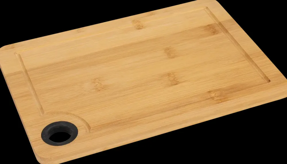 Stilrent skærebræt i bambus med silikonering og en praktisk saftrille.Skærebrættet er lavet i bambus og har derfor et fint naturligt look, så det også kan bruges som serveringsbræt til tapas, sushi eller frugt og grønt.