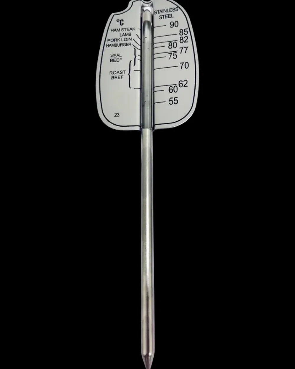 Hold styr på temperaturen med dette stegetermometer.Termometeret er ideelt til at sikre perfekt tilberedning af dine stege.Den kan måle op til 90°C og er lavet af rustfrit stål.Opvask i hånden anbefales.Produktet er ikke beregnet til brug i ovn/grill i længere tid, lad derfor aldrig termometeret sidde i maden under hele tilberedning i ovn/grill.