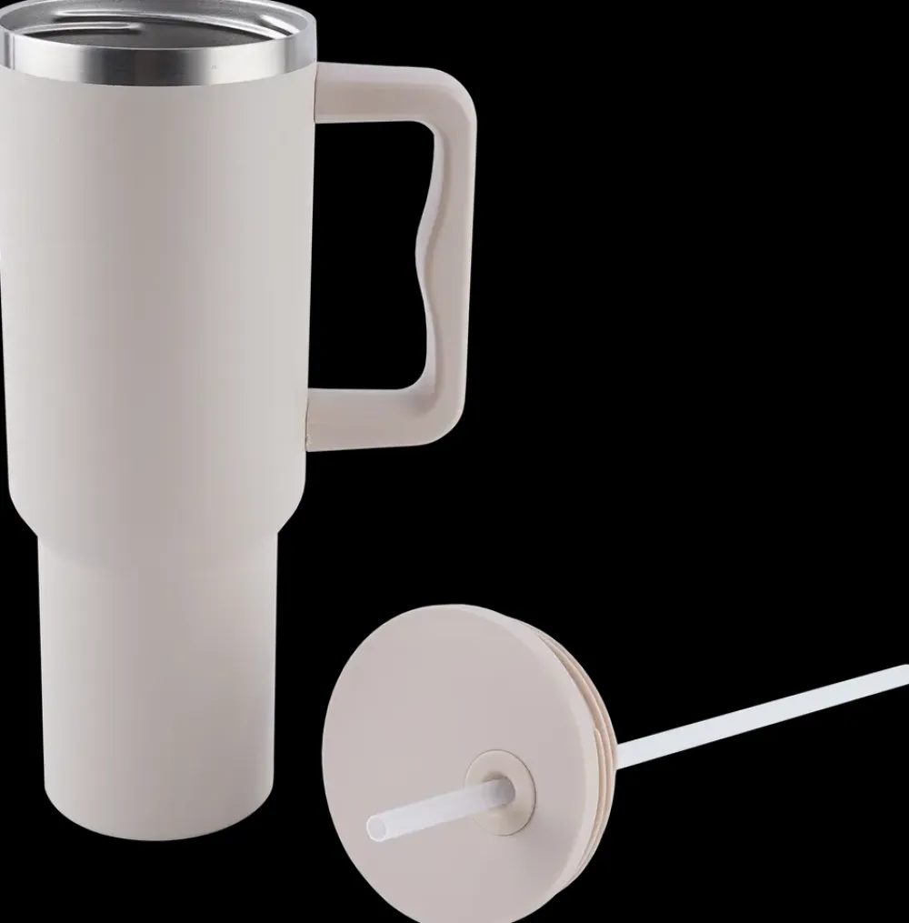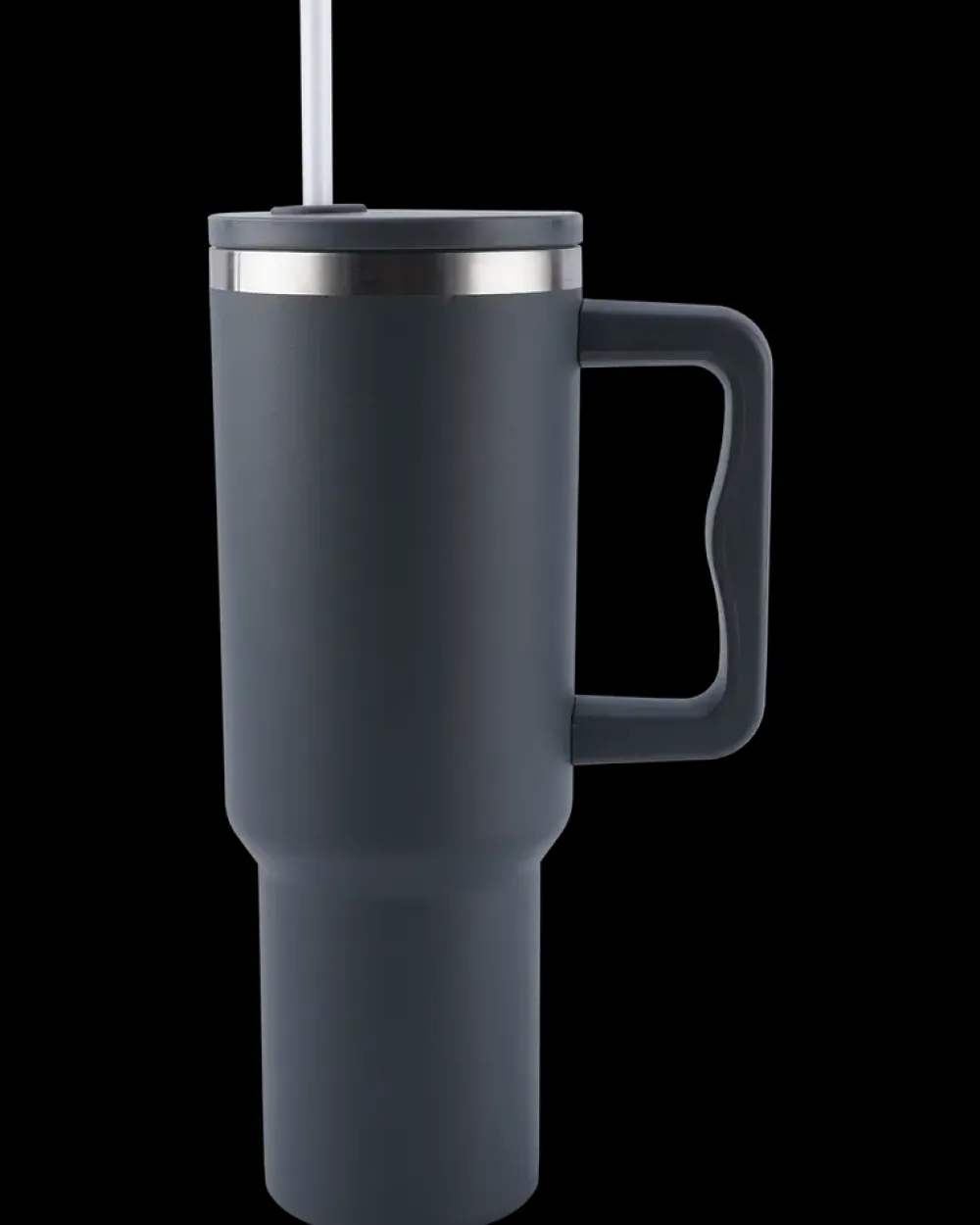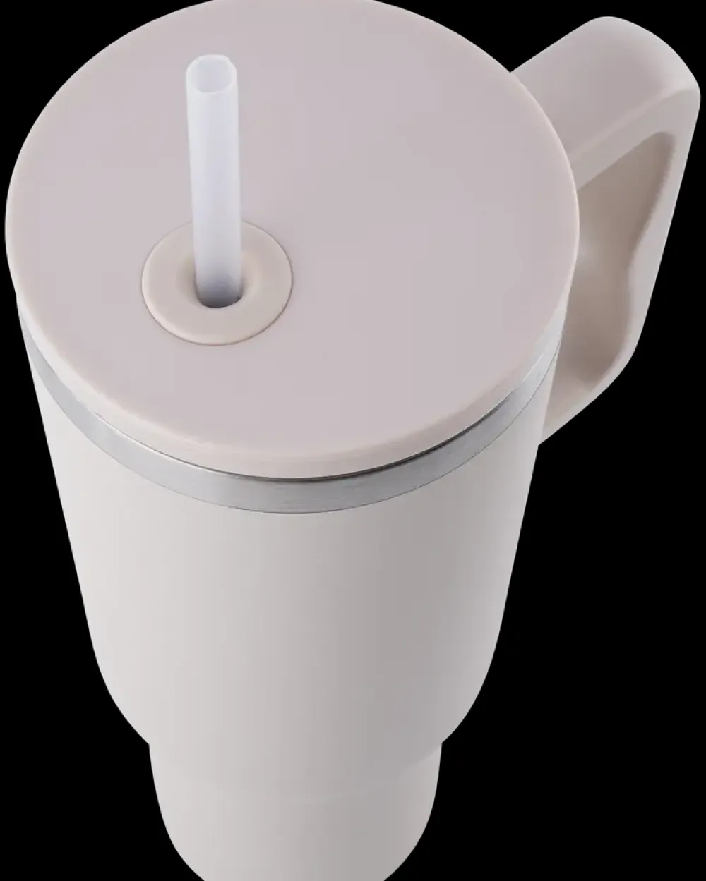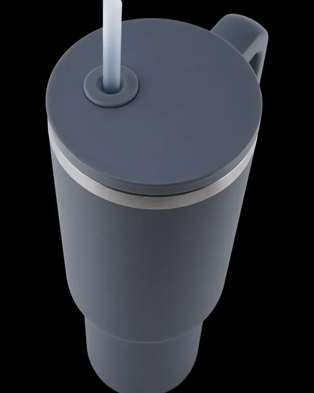 Rummelig termokop på 1,2 liter. Fremstillet i rustfrit stål (inderside SS18/8, yderside SS15/1) kombineret med PP-plast og silikone. Udstyret med solidt håndtag, som gør koppen nem at holde og transportere.Der medfølger et sugerør i PP-plast, velegnet til kolde drikke. Ved varme drikke anbefales det, at temperaturen ikke overstiger 50 °C ved brug af sugerør.Måler ca. 26 cm i højden og 10 cm i diameter (15 cm inkl. håndtag). Robust og let at rengøre.Farve kan ikke vælges ved køb i webshoppen.