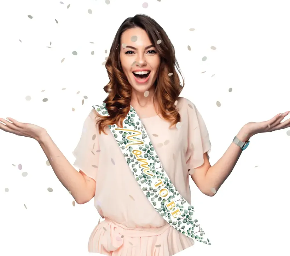 Hvidt skærf med eucalyptus og teksten ‘Mom to Be’.