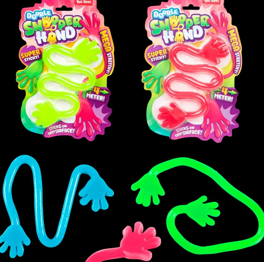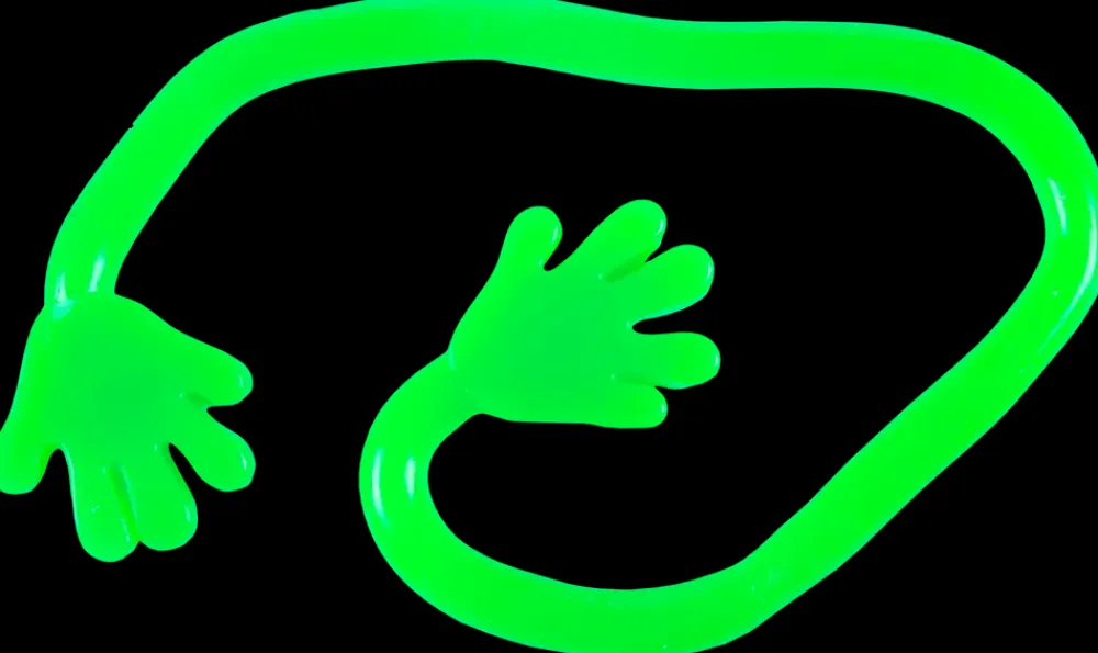 En elastisk slimhånd til leg, hvor lange kast og stræk giver underholdning for børn fra 3 år. Hånden kan bruges til at gribe og ramme glatte overflader, hvilket gør den egnet til indendørs aktiviteter og korte legepauser.Den fleksible konstruktion giver mulighed for at strække legetøjet op til flere meter, og den klæbende overflade gør, at hånden kortvarigt hæfter på mange typer underlag. Produktet kan anvendes igen og igen ved almindelig leg og giver variation gennem de forskellige farver, det leveres i.Modellen måler B. 8 x L. 26 cm og er fremstillet af polyethylen. Farverne varierer mellem gul, pink, blå og grøn. Anbefalet alder er 3+.Farve kan ikke vælges ved køb i webshoppen.