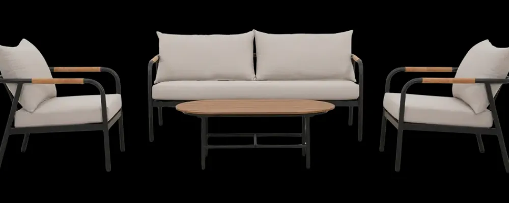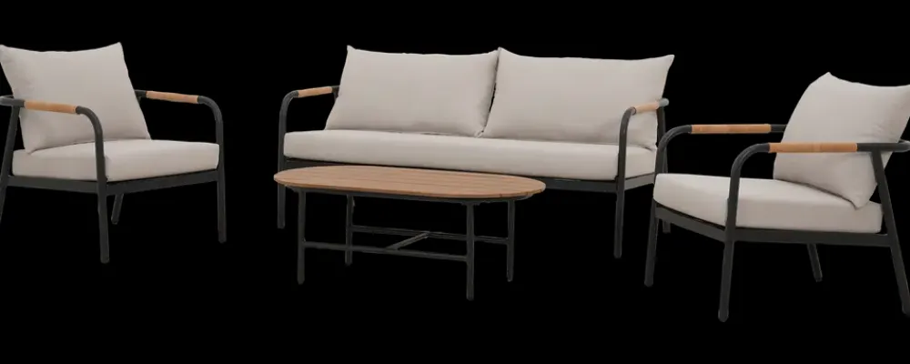 Sofasæt i 4 dele til terrasse og have med stel i aluminium og hynder i polyester. Sættet består af sofa, to stole og bord og giver en samlet løsning til udendørs ophold. Hynder med en tykkelse på 12 cm giver en behagelig siddekomfort.Sofa og stole har armlæn med detaljer i kork samt sæde og ryghynder i polyester. Bordet har bordplade med lameller og stel i aluminium. Konstruktionen er egnet til terrasse, altan eller have. Leveres delvist samlet.Tekniske detaljer og mål:Sædehøjde: 32 cmSædedybde: 60 cmSædebredde: 60 cmArmlænshøjde: 63 cmHyndetykkelse: 12 cmStoftype: PolyesterSofa: H. 63 x B. 166 x D. 76 cmStol: H. 63 x B. 67 x D. 76 cmBord: H. 40 x B. 110 x D. 59 cmFarver: Beige, sort, kork, teakMaterialer: Aluminium, kork, polyester, textilene