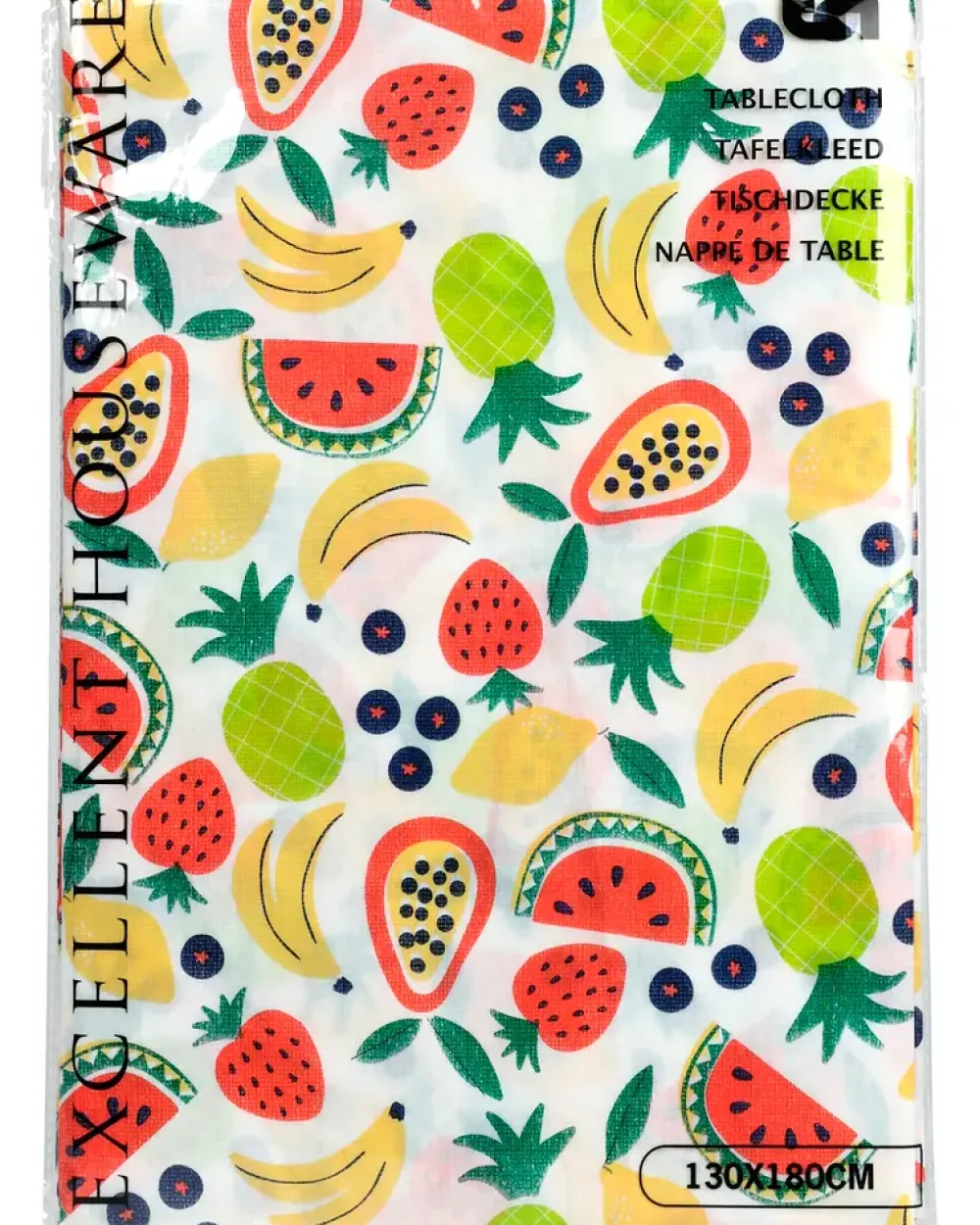 Festlig borddug med sommermotiv i friske farver.Sælges i assorterede motiver (frugt- eller blomstermotiv), der pynter på ethvert sommerbord.Dugen er udført i PEVA med bagside i flannel.Bemærk, at dugen kun sælges i vores fysiske butikker.