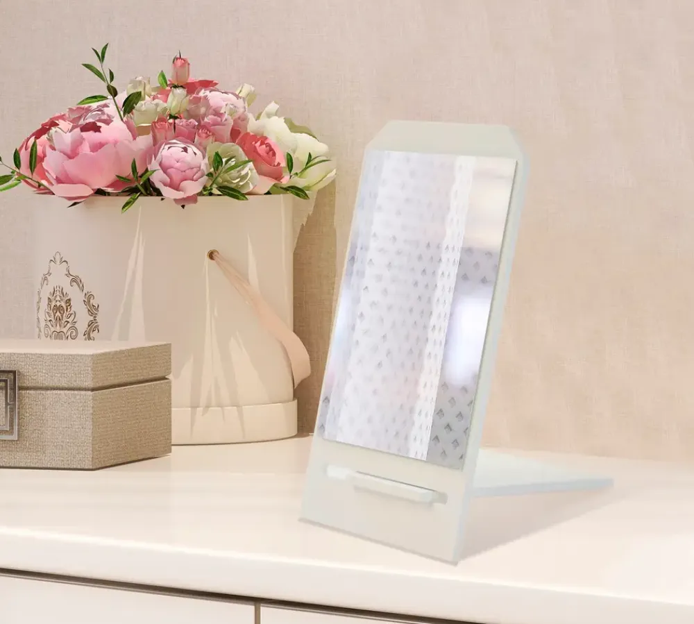 Dette lille spejl er oplagt til at stille på bordet som f.eks. makeup-spejl, da det har hældningen til dette.Med sit simple og moderne design passer den ind i de fleste boligindretninger.