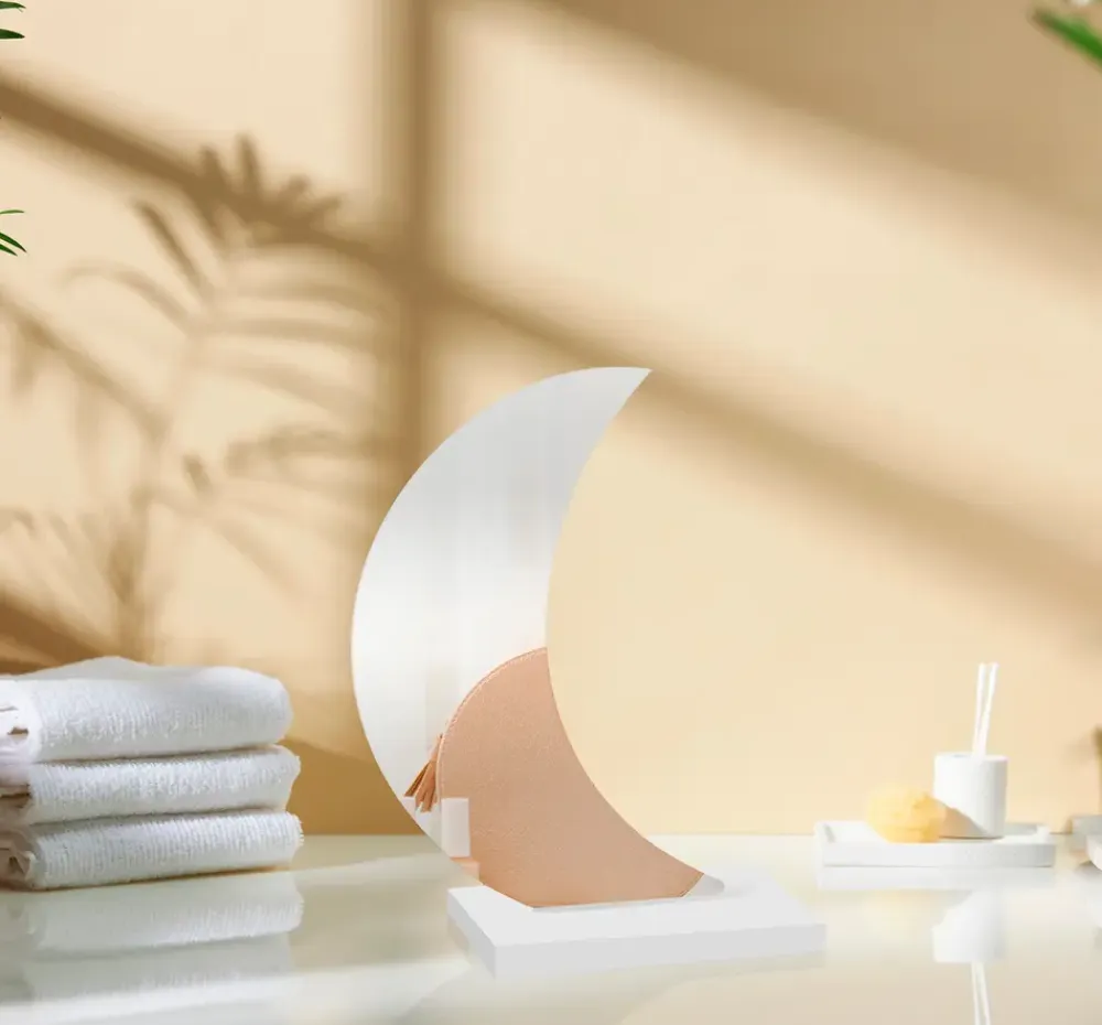 Dette måneformede spejl på en lille fod er et oplagt valg som udsmykning til f.eks. hylden, bordet, eller skænken.