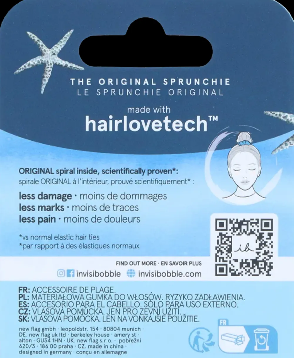 Sprunchie er en retro hårelastik med spiralform.Sprunchien sidder godt fast uden at efterlade mærker i håret.invisibobble-sprunchien er designet til at være mindre skadende for håret og mere behagelig end almindelige elastikker.Denne sprunchie kommer med et mønster i blå nuancer, der leder tankerne hen på blåt, klart vand på stranden under en skyfri himmel.