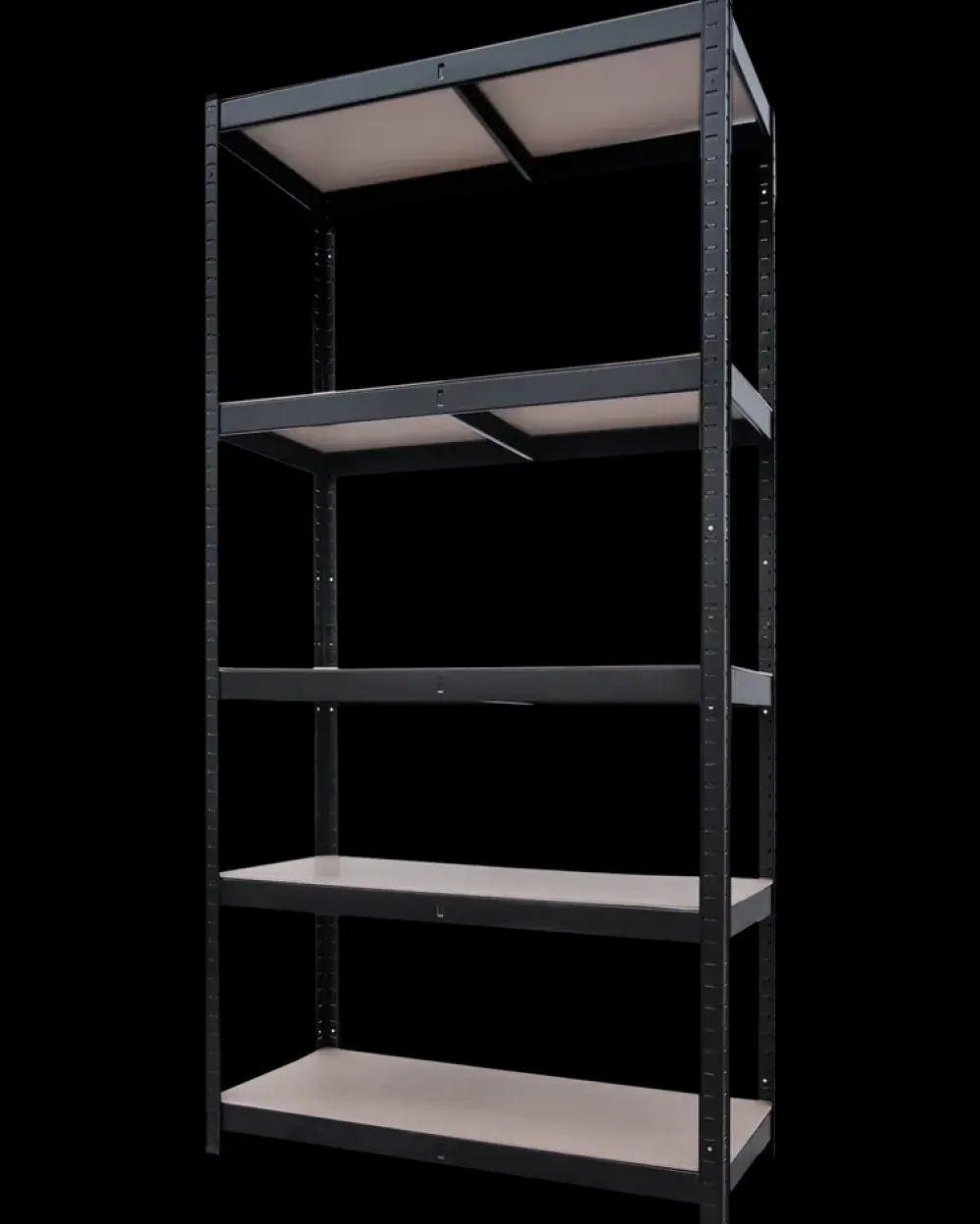 Sort, pulverlakeret stålreol med 5 hylder af 4 mm MDF. Maks. belastning pr. hylde er 175 kg ved lige fordeling på hylden. Reolens samlede maks. belastning er således 875 kg. Bemærk! Fordel det opbevarede gods ligeligt på reolen.MDF-pladerne er ikke efterbehandlet og kan derfor ikke tåle større fugtpåvirkning.