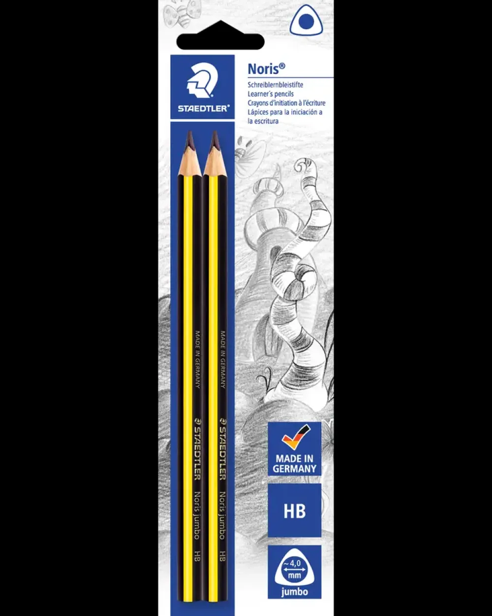 Noris® Jumbo blyant med ergonomisk trekantet greb for afslappet og let tegning.Ideel til de første tegne- og skriveoplevelser.Ekstra brudstærk 4 mm mine i HB.Fremstillet af træ fra bæredygtigt skovbrug.Hårdhed: HB, mellem hårdhed.Tykkelse: 4 mm.Made in Germany.