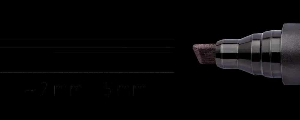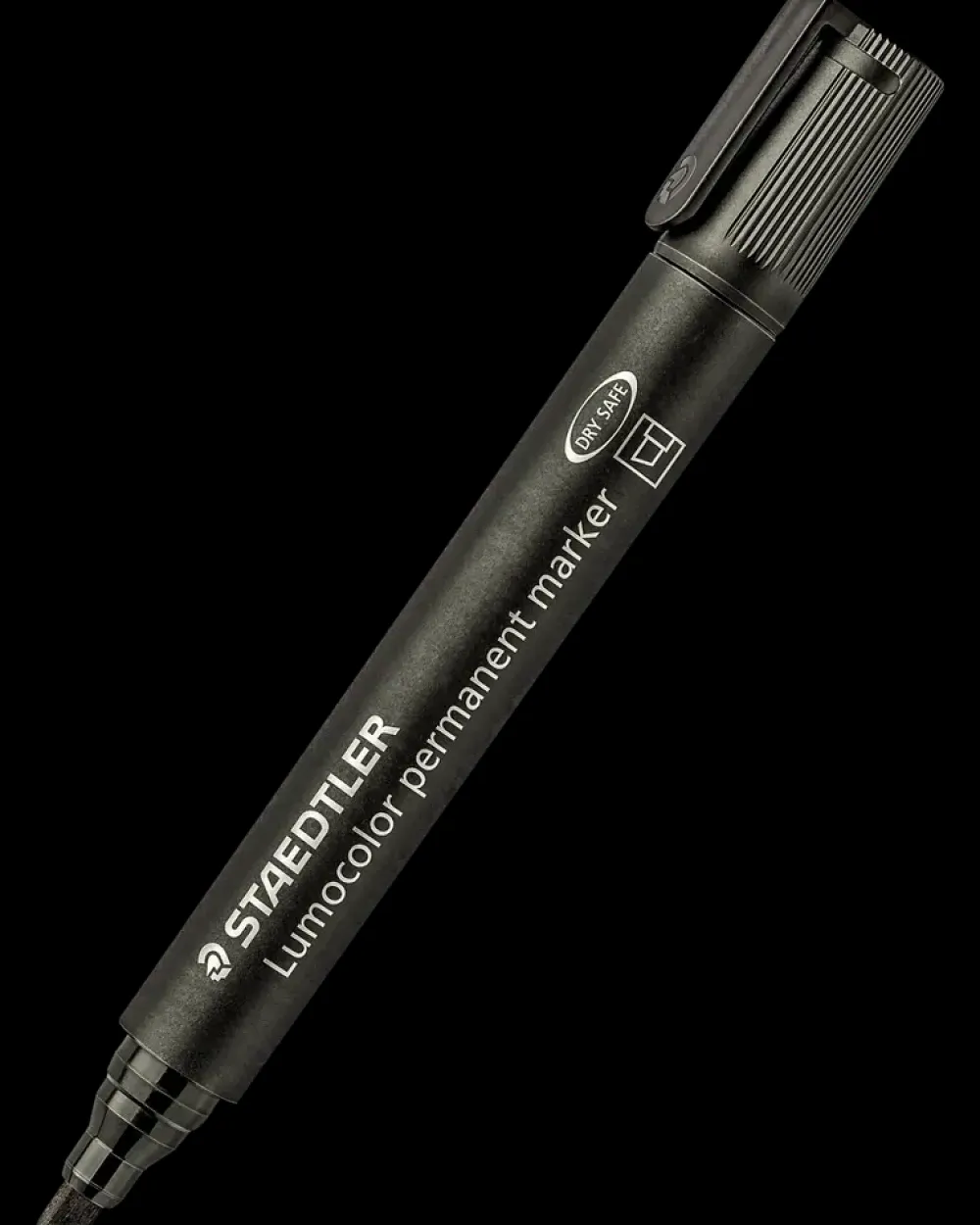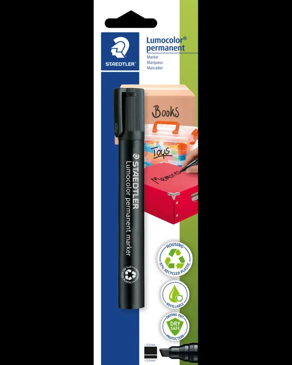 Lumocolor® permanent marker med skrå spids.Fremragende smudsafvisende og vandtætte egenskaber på næsten alle overflader.Tørrer på få sekunder, derfor ideel til venstrehåndede brugere.Farve-intensiv og minimal lugt.Sort er vejrbestandig.DRY SAFE: Kan efterlades uden hætte i dagevis uden at udtørre.Flysikker – automatisk trykudligning forhindrer pen i at lække ombord på fly.Stregbredde: 2 og 5 mm.Egenskaber: God til glas, pap, plast, træ, metal m.m.Låst spids.Lysægte.Made in Germany.