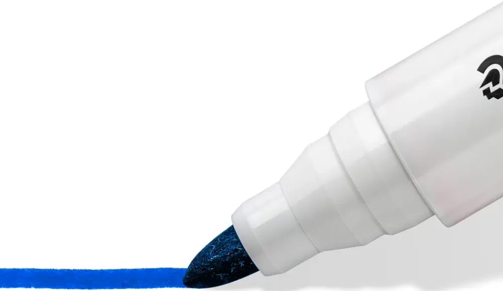 Whiteboardmarkere til skrivning, markering og visuel præsentation på whiteboards samt glatte overflader. Anvendes i mødelokaler, undervisning og kontormiljøer, hvor information skal kunne ændres og fjernes løbende. Rund spids giver en ensartet streg, som er velegnet til både tekst og enkle tegninger.Blækket tørrer hurtigt og kan let tørres af whiteboards samt overflader som glas og porcelæn. Lav lugt gør pennen egnet til daglig brug i lukkede rum. Konstruktionen sikrer stabil drift, og spidsen er fastgjort for at modstå tryk under brug. Pennen kan efterlades uden låg i længere tid uden at tørre ud. Trykudligning mindsker risiko for lækage ved transport, herunder flyrejser.Skaft og hætte er fremstillet i plast, og pennen kan genopfyldes, hvilket forlænger levetiden. Genopfyldes med genopfyldningsstation 488 51.Tekniske detaljer:Stregbredde: ca. 2,0 mmSpids: rundAntal: 8 stk.Farver: assorteredeMateriale: plast (hylster, hætte og ende i 97% genanvendt plast)Model: Lumocolor® 351Variant/farve kan ikke vælges ved køb i webshoppen.
