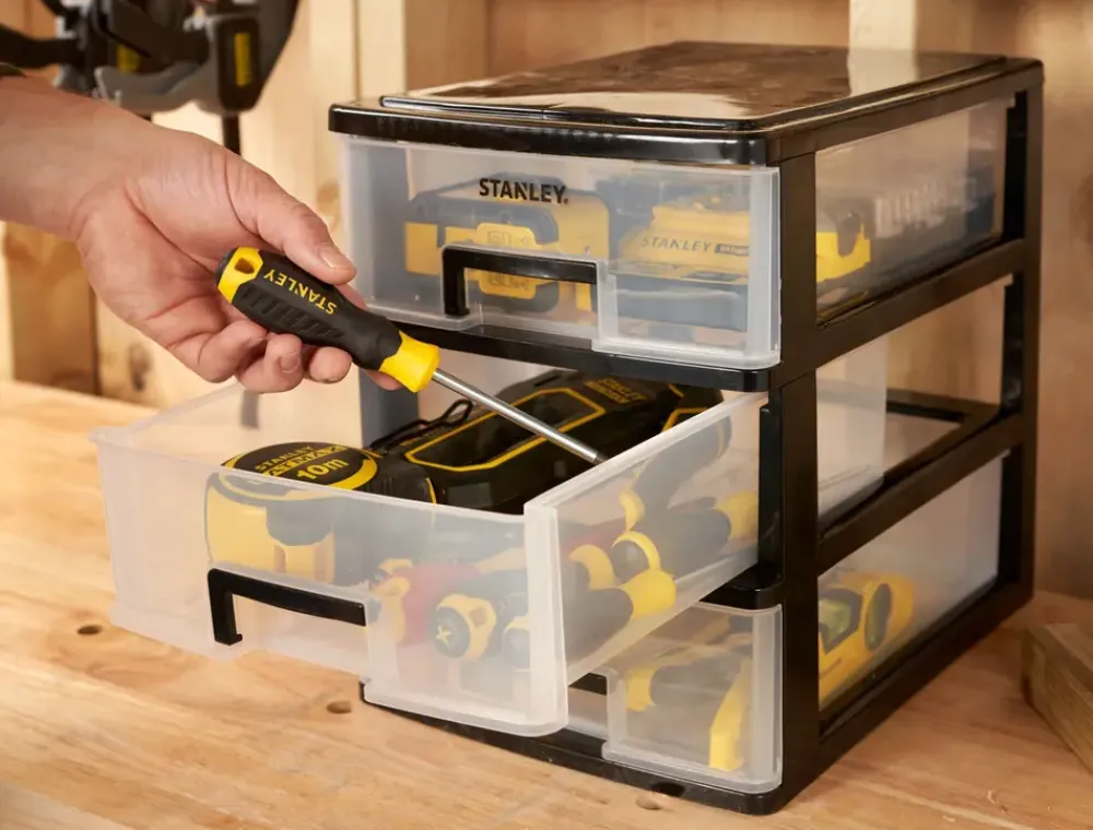 Hold dine små dele, og tilbehør organiseret I stor 3-skuffers opbevaringsenhed. Transparente skuffer giver synlighed af indholdet. Ideel til brug i værksteder og garager.