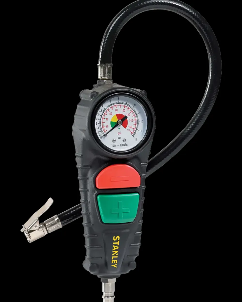 Pumpepistol med manometer fra Stanley med 3-i-1 funktion: pumper, tømmer og måler dæktryk.Velegnet til cykeldæk, diverse dæk, bolde og små luftmadrasser.