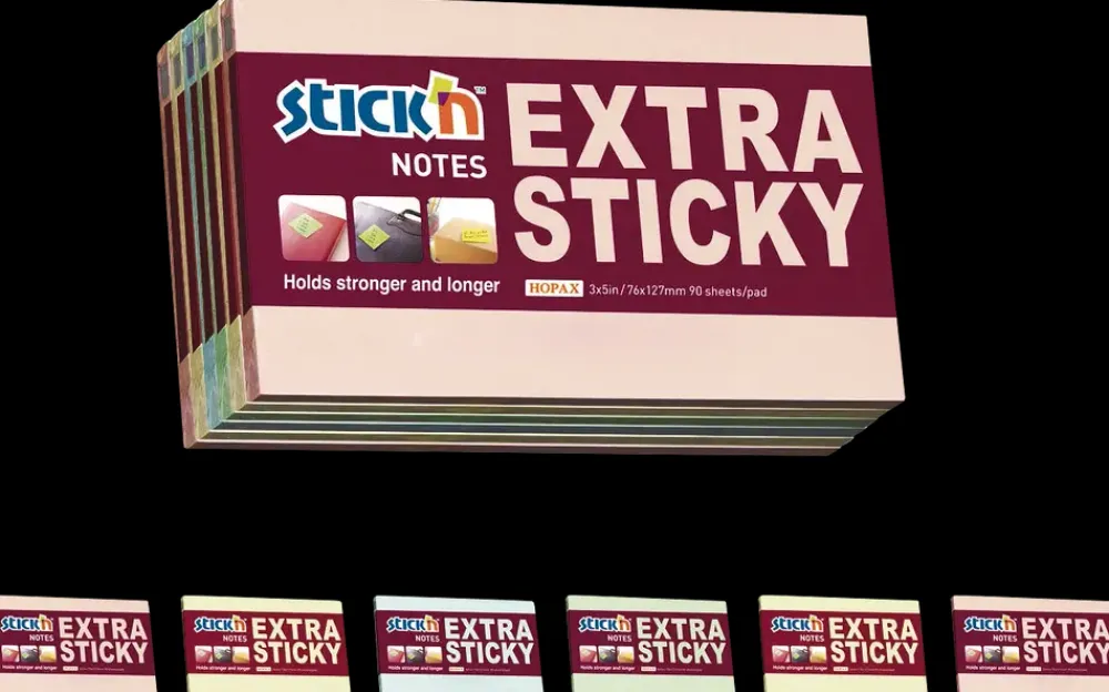 Selvklæbende Sticky Notes med ekstra stærk klæbeevne der hæfter overalt igen og igen uden at beskadige overfladen.Klæber fint på karton, glas, metal etc.Extra Sticky Notes 76×127 mm 90 ark pr. blok. Pakke med 6 blokke: Pastel Pink 2 stk. , Pastel Gul 2 stk., Pastel Blå 1 stk. og Pastel Grøn 1 stk.Farver: Pastel
