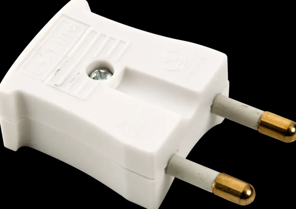 Lille og flad stikprop som med fordel kan placeres ved siden af et rundt stik i en dobbeltstikkontakt.