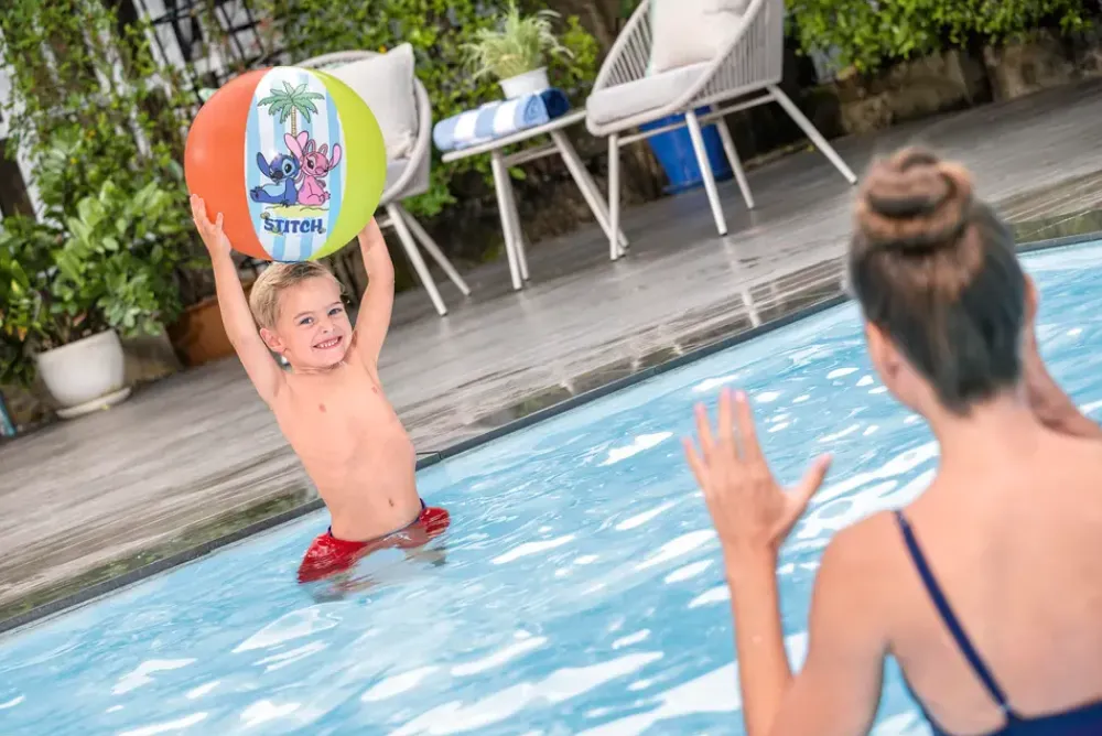 Oppustelig badebold med motiv, velegnet til leg i poolen, haven og på stranden. Bolden er let og nem for mindre børn at håndtere og bruges til kast, rul og leg i og omkring vand.Bolden pustes nemt op og kan tømmes for luft igen efter brug. Det gør den enkel at transportere og opbevare, når den ikke er i brug. Det runde design og den glatte overflade gør den velegnet til både vandleg og leg på land under opsyn.Diameter: Ø51 cmAnbefalet alder: 2+Motiv: StitchMateriale: PVC