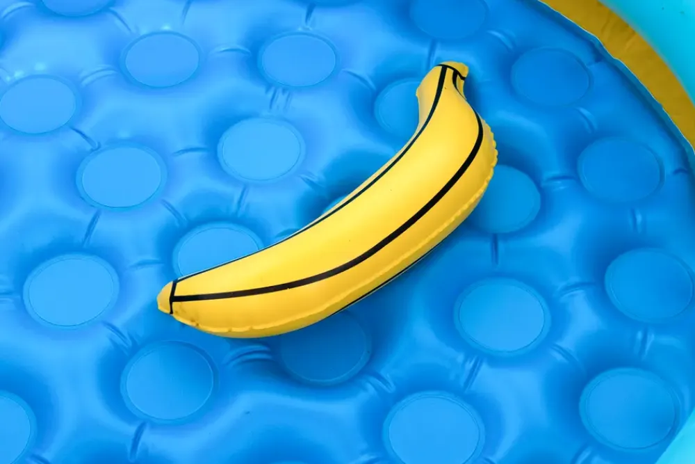 Poolen giver små børn mulighed for at lege og blive afkølet på varme dage. Konstruktionen består af en rund, oppustelig base med grafiske plantemotiver og en bund med blød, struktureret overflade. De tre oppustelige buer danner en let overdækning, hvor de grønne palmeblade giver en vis skygge over bassinets midte.Aben, som sidder fast på den ene bue, kan tages af efter behov og bruges som legetøj. Den medfølgende oppustelige banan giver ekstra legemuligheder i vandet. Poolens kanthøjde er 20 cm, hvilket gør den egnet til mindre vandmængder.Materialet er PVC i flere farver, og den runde form giver god stabilitet. En reparationslap følger med til mindre udbedringer af overfladen. Produktet er egnet til brug udendørs og skal anvendes under konstant opsyn af en voksen.