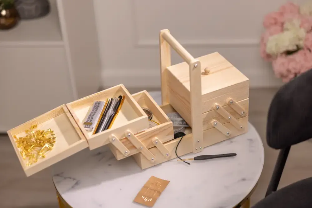 Smart syæske til opbevaring af strikke-, hækle- og sytilbehør. Masser af rum til at organisere. Kassen er fremstillet i fyrretræ og er ganske let, så den er nem at tage med på farten.Mål, fuldt udslået: H. 25 x B. 14,5 x L. 82 cm.Materiale: Fyrretræ.