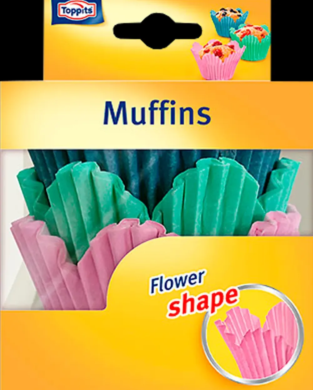 Muffinform fra Toppits, der er udformet i papir. Muffinformen har en dekorativ blomsterform. Klæber ikke, og fedtet trænger ikke ind. Har en høj formstabilitet.