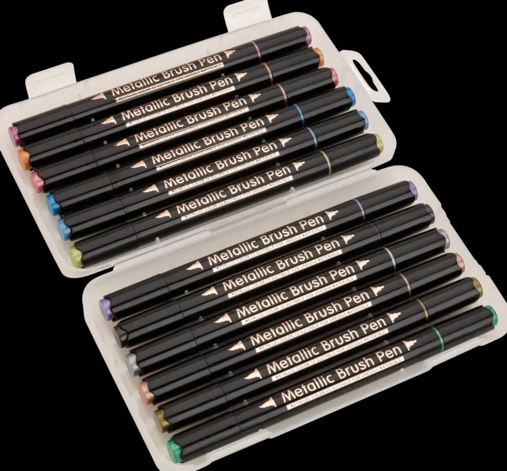 Metallic brushpen i 12 farver til dekoration, kortskrivning og kreative projekter. Sættet indeholder dobbelttuscher med både fleksibel brush tip og fin bullet tip, som giver mulighed for både brede og smalle streger i samme pen. Velegnet til håndskrift, illustrationer, skitser og fremhævning.Brush-spidsen kan bruges til kalligrafi, farvelægning og større flader, mens den runde fine spids egner sig til detaljer og præcise linjer. De metalliske farver giver en dækkende effekt på både lyst og mørkt papir og kan skabe kontrast i noter og kreative arbejder.Tekniske detaljer:Antal: 12 farverType: DobbelttuschSpidser: Brush og bullet tip