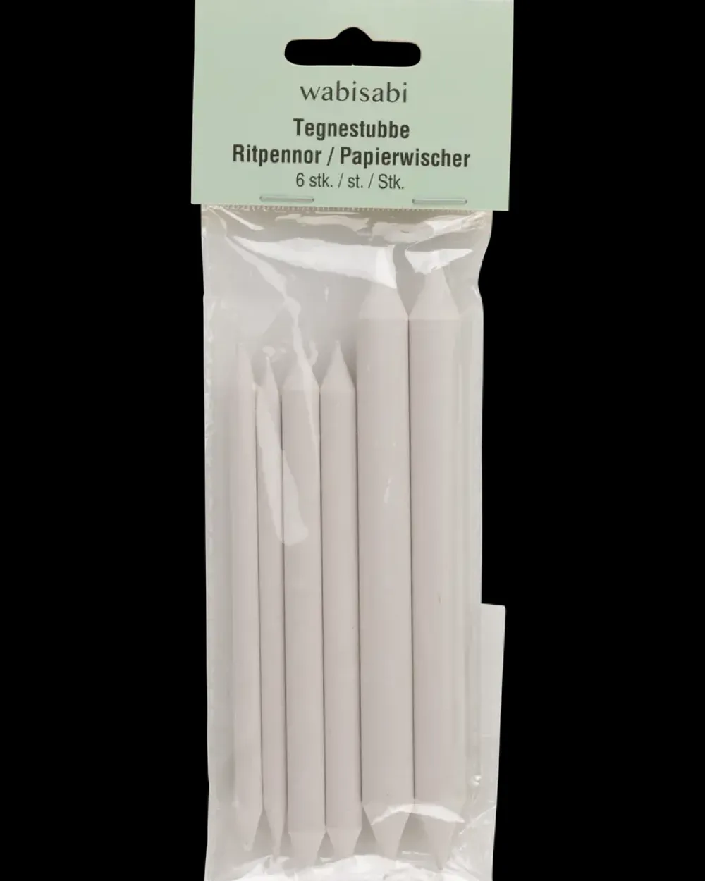 Tegnestubbe i sæt med 6 stk. anvendes til at udtone og blødgøre streger i tegninger udført med blyant eller kul. Redskabet gør det lettere at skabe skygger og glidende overgange i både skitser og mere detaljerede illustrationer.Stubberne bruges ved at gnide hen over stregerne, så farven fordeles jævnt på papiret. Det giver bedre kontrol over gradueringer og gør det muligt at arbejde præcist med lys og skygge. Velegnet til både hobbybrug, skoleopgaver og kreative projekter.Fremstillet af komprimeret papirmateriale med tæt struktur, som giver ensartet udtoning uden at beskadige papirfladen. Overfladen er udformet, så den ligger stabilt i hånden under brug.Varenr.: 44132