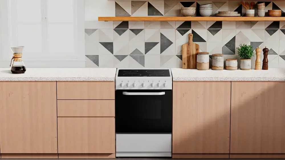 Dette glaskeramiske komfur fra WASCO har en ovnkapacitet på 65 liter og tilbyder 9 funktioner, herunder konventionel varme, varmluft, grill og optøning. Kogepladen har fire zoner: to på 1200 watt og to på 1800 watt, så du nemt kan tilberede flere retter ad gangen.Komfuret betjenes med mekaniske drejeknapper og har energiklasse A. Ovnlågen er udstyret med to-lags glas for øget sikkerhed. Ovnrummet er formstøbt uden side-ribber og har 5 hyldeniveauer. Der medfølger dyb og lav bradepande samt ovnrist. Komfuret har justerbare fødder og udtræksskuffe.Apparatet leveres uden strømledning, og det skal tilsluttes af en autoriseret elektriker.3 års garanti.Tilbehør1 dyb bradepande1 lav bradepande1 ovnristSpecifikationerOvnkapacitet: 65 literAntal ovnfunktioner: 9 (inkl. varmluft, grill og optøning)Kogeplade: Glaskeramisk, 6000 watt2 zoner á 1200 watt2 zoner á 1800 wattEnergiklasse: ABetjening: Mekaniske drejeknapperOvnlåge: 2-lags glasOvnrumsdesign: Uden side-ribberHyldeniveauer: 5Underskuffe: Udtræksskuffe i bundenFødder: JusterbareMål (BxDxH): 60 x 60 x 90 cm