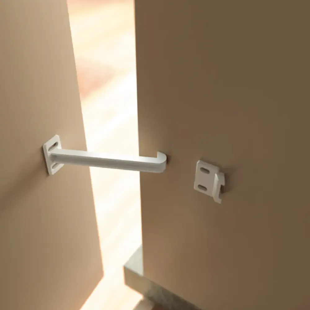 Skabs- og skuffelås 2 stk. pr. pakke.Forhindre børn i at åbne skabe eller skuffer.Kan monteres med dobbeltklæbende tape eller skruer, indvendigt i skabene.