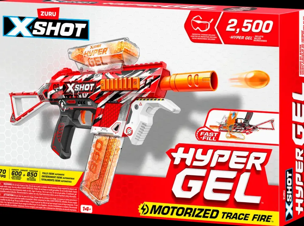 Gør dig klar til action med XSHOT Hyper Gel Trace Fire – en motoriseret Gel Blaster, der kan affyre Hyper Gel Pellets med en hastighed på op til 21 meter i sekundet. Blasteren kan indstilles til både fuld- og halvautomatisk tilstand og leveres med et genopladeligt batteri, så legen kan fortsætte uden brug af engangsbatterier.Trace Fire har et magasin med plads til 800 Hyper Gel Pellets samt et ekstra magasin med samme kapacitet. De medfølgende Hyper Gel Pellets aktiveres ved blot at tilsætte vand og er både giftfri, miljøvenlige og pletfri.Blasteren er fremstillet i en kombination af ABS-plast, metal og andre holdbare materialer, der sikrer lang levetid og robust konstruktion. Det flerfarvede design og ergonomiske greb giver et sikkert og behageligt greb under brug. Medfølgende beskyttelsesbriller øger sikkerheden under kampene, så du kan fokusere på spillet.
