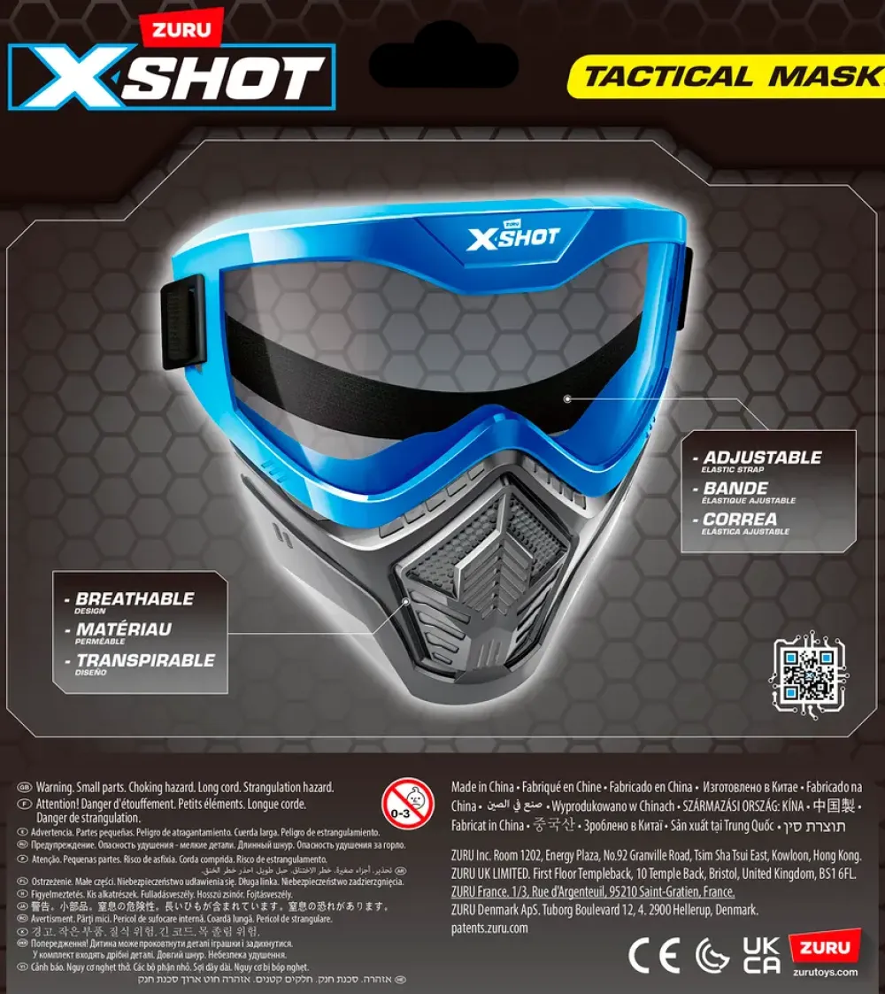 Den taktiske XSHOT-maske giver beskyttelse og komfort under leg med blastere. Masken sidder tæt om ansigtet og beskytter mod skud under aktive lege. Den justerbare strop gør det nemt at tilpasse pasformen, så masken sidder sikkert.Masken er fremstillet af slidstærke materialer: polypropylen, polycarbonat og silikone. Kombinationen giver både holdbarhed og fleksibilitet. Ventilationshuller ved mund og næse sikrer god luftgennemstrømning og behagelig brug i længere tid.Velegnet til både indendørs og udendørs blasterlege, hvor beskyttelse og bevægelsesfrihed er vigtig. Masken har et moderne design i blå og grå farver, der passer til resten af XSHOT-serien.Ikke egnet for børn under 3 år.